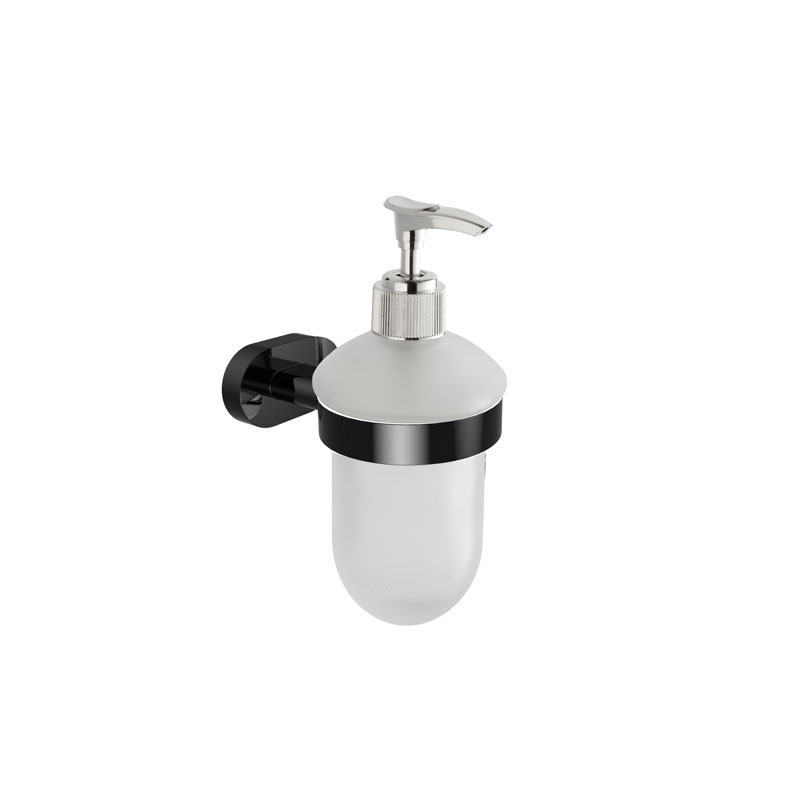 Γυάλινο δοχείο υγρού σαπουνιού NEW OVAL 75079-MB. Η βάση του είναι κατασκευασμένη από μπρούτζο και φέρει φινίρισμα μαύρου ματ. Η τοποθέτηση του γίνεται επιτοίχια και φέρει μεταλλική λαβή για μεγαλύτερη αντοχή.