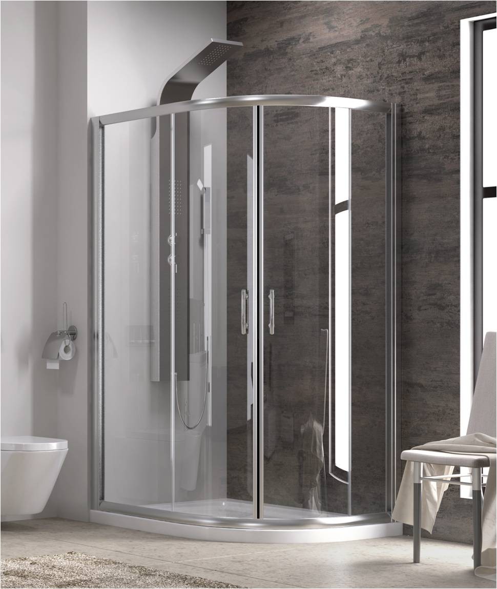 Ημικυκλική ασύμμετρη γωνιακή καμπίνα με δύο σταθερά κρύσταλλα και δύο συρόμενες πόρτες, ανθεκτικής κατασκευής.