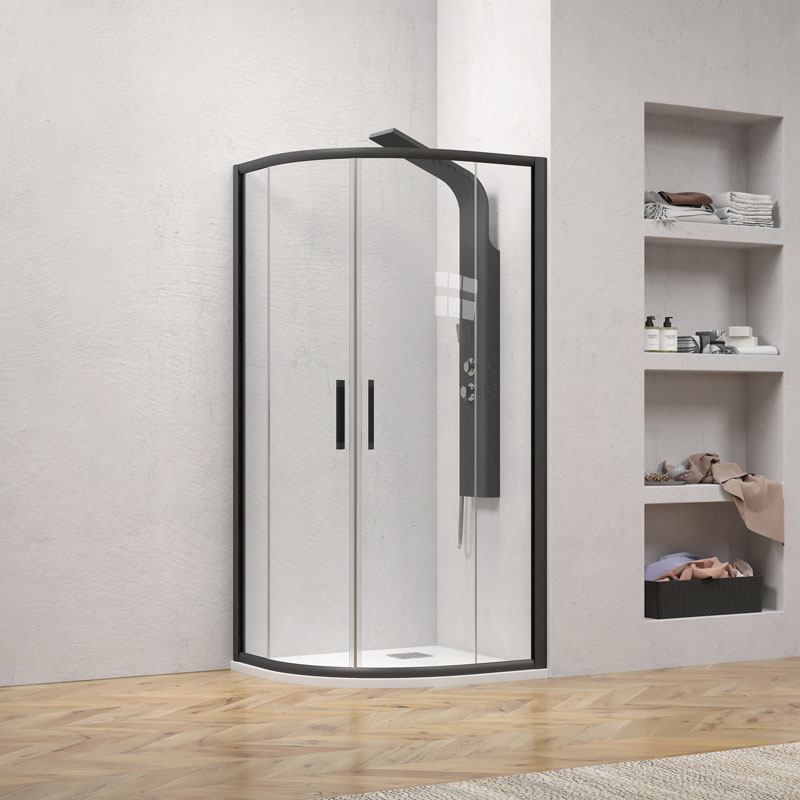 Ημικυκλική καμπίνα γωνιακής τοποθέτησης, με δύο σταθερά κρύσταλλα και δύο συρόμενες πόρτες.
