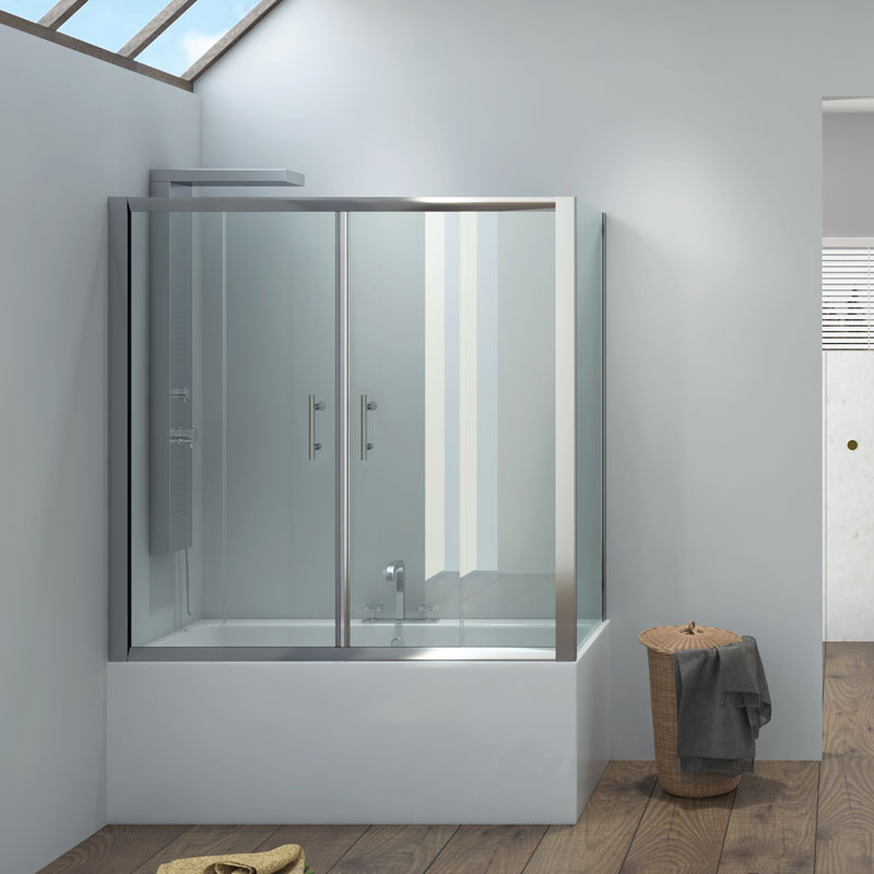 Καμπίνα μπανιέρας FLORA 300 με δύο συρόμενες πόρτες και τέσσερα σταθερά κρύσταλλα.