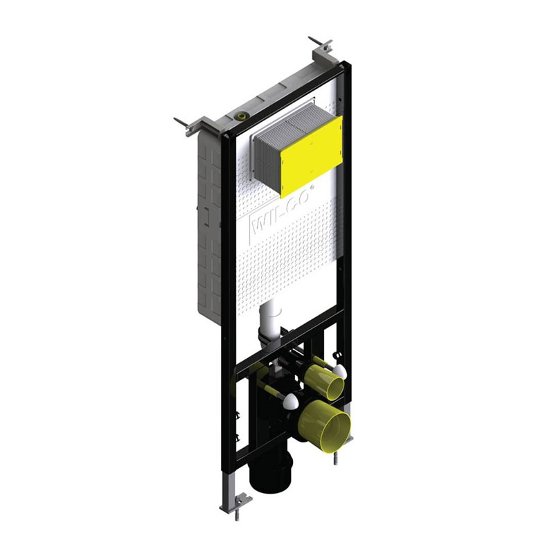 Τα νέα εντοιχισμένα καζανάκια είναι πλήρως μονωμένα με διογκωμένη πολυστερίνη. Αυτή η μόνωση βοηθά το εντοιχισμένο καζανάκι να αποκτήσει εξαιρετική αντίσταση στην κρούση και διπλή μείωση της στάθμης θορύβου. Ο όγκος του νερού είναι 6lt μέγιστο. Η δεξαμενή είναι εξοπλισμένη με ορειχάλκινη διπλή βαλβίδα εκκένωσης. Οι όγκοι έκπλυσης μπορούν να ρυθμιστούν 3lt ή 6lt. Η πλακέτα χειρισμού δεν περιλαμβάνετε στο σετ του καζανακίου. Όλα τα μοντέλα συνοδεύονται με συστολή 100/90 η οποία επιτρέπει την μετατροπή της αποχέτευσης από Ø100 σε Ø90 καθώς και ρυθμιζόμενες ντίζες στήριξης της λεκάνης που ρυθμίζονται για διάκεντρο 18cm ή 23cm. Το πλαίσιο των καζανακίων είναι ηλεκτροστατικά βαμμένο με αποξειδική βαφή, ενώ οι βάσεις ρύθμισης του ύψους είναι γαλβάνιζέ. Το μέγιστο φορτίο ανάρτησης είναι 400Kg.