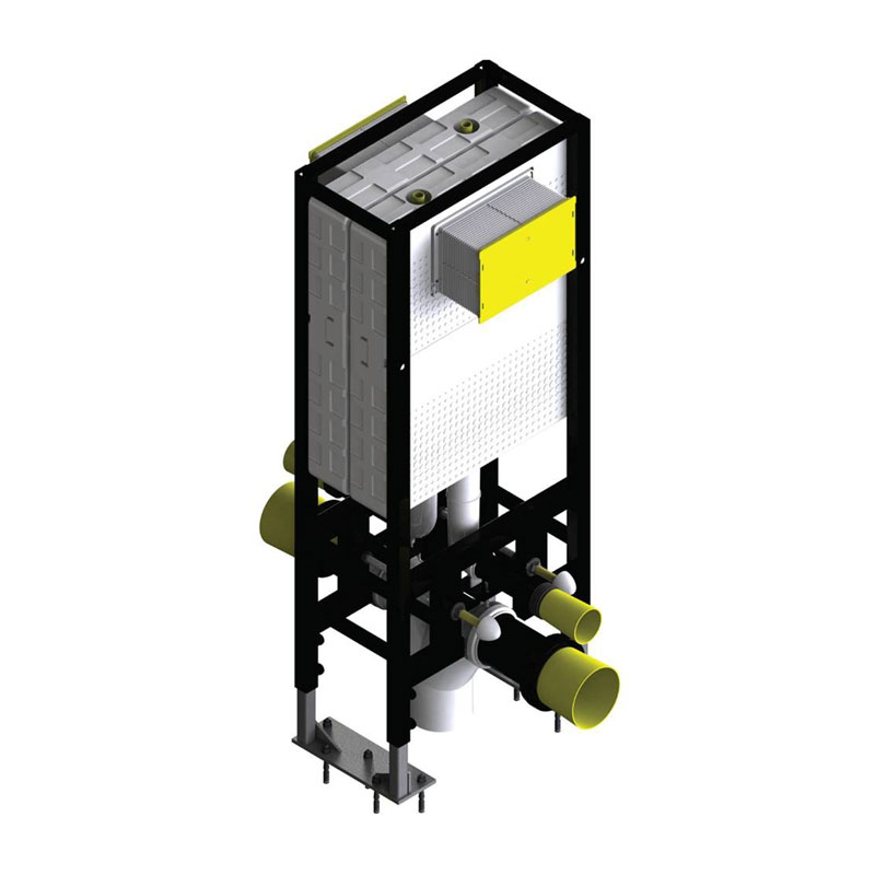 Τα νέα εντοιχισμένα καζανάκια είναι πλήρως μονωμένα με διογκωμένη πολυστερίνη. Αυτή η μόνωση βοηθά το εντοιχισμένο καζανάκι να αποκτήσει εξαιρετική αντίσταση στην κρούση και διπλή μείωση της στάθμης θορύβου. Ο όγκος του νερού είναι 6lt μέγιστο. Η δεξαμενή είναι εξοπλισμένη με ορειχάλκινη διπλή βαλβίδα εκκένωσης. Οι όγκοι έκπλυσης μπορούν να ρυθμιστούν 3lt ή 6lt. Η πλακέτα χειρισμού δεν περιλαμβάνετε στο σετ του καζανακίου. Όλα τα μοντέλα συνοδεύονται με συστολή 100/90 η οποία επιτρέπει την μετατροπή της αποχέτευσης από Ø100 σε Ø90 καθώς και ρυθμιζόμενες ντίζες στήριξης της λεκάνης που ρυθμίζονται για διάκεντρο 18cm ή 23cm. Το πλαίσιο των καζανακίων είναι ηλεκτροστατικά βαμμένο με αποξειδική βαφή, ενώ οι βάσεις ρύθμισης του ύψους είναι γαλβάνιζέ. Το μέγιστο φορτίο ανάρτησης είναι 400Kg.