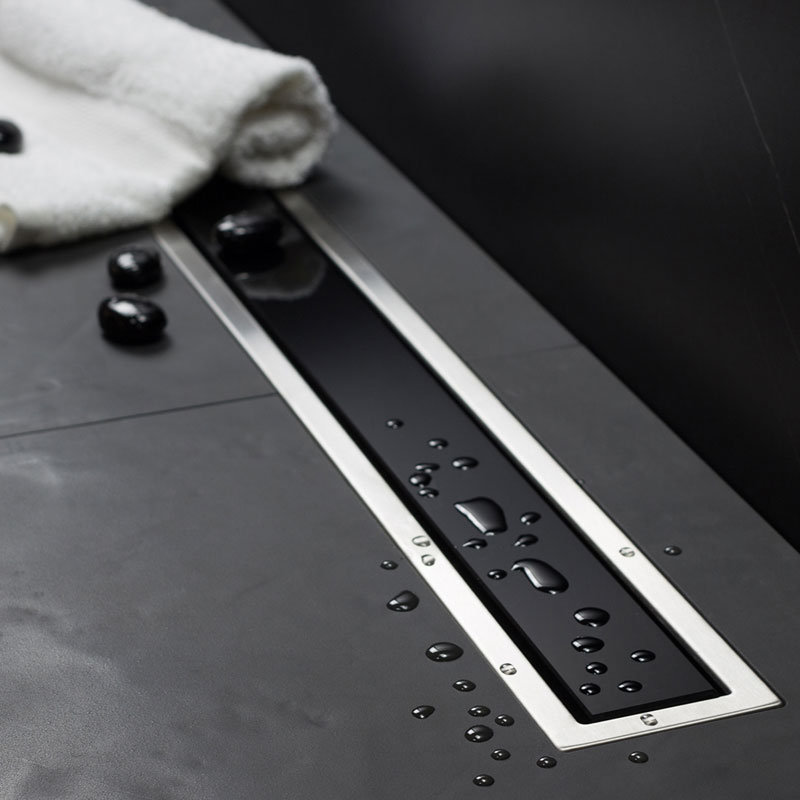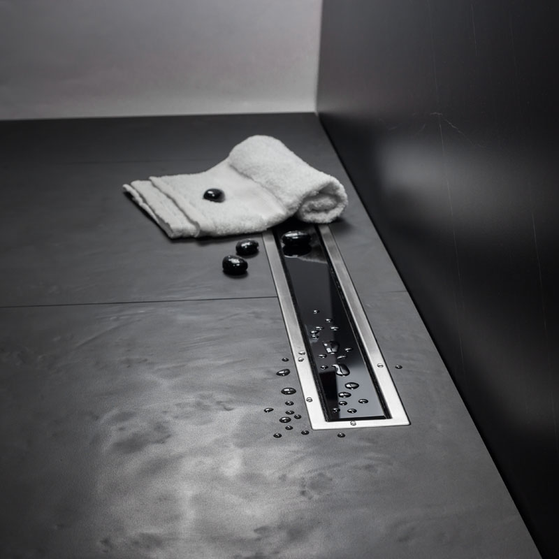 Σιφόνι δαπέδου ευθύγραμμο, χαμηλού προφίλ που καταλαμβάνει τον ελάχιστα δυνατό χώρο κάτω από το δάπεδο. Σχάρα κατασκευασμένη από ανοξείδωτο ατσάλι 18/10, η οποία περιλαμβάνει μαύρο γυαλί ασφαλείας.